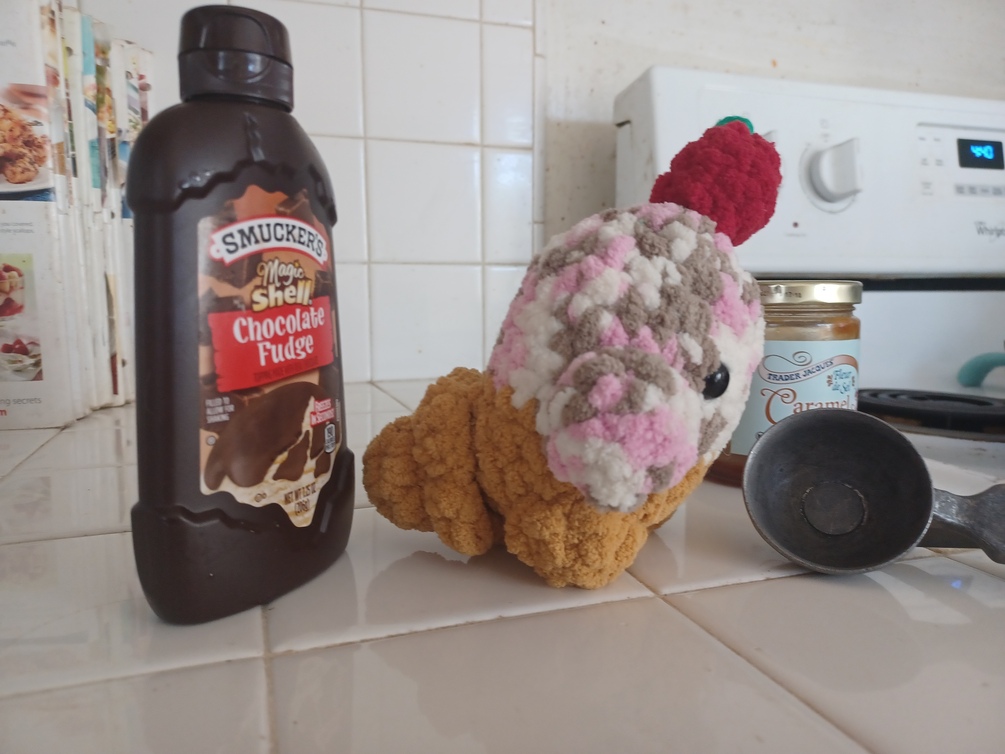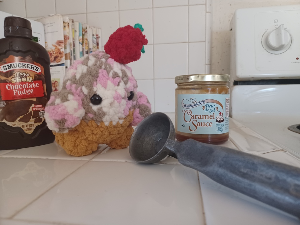 This sweet Ice Cream Dinosaur will give you a frozen feel to life. And made with love and soft yarn. It is a handmade item. Warning this is not a toy and is not intended for a kid under the age of 3. Made with soft polyester yarn, comforting, handmade, Plushy